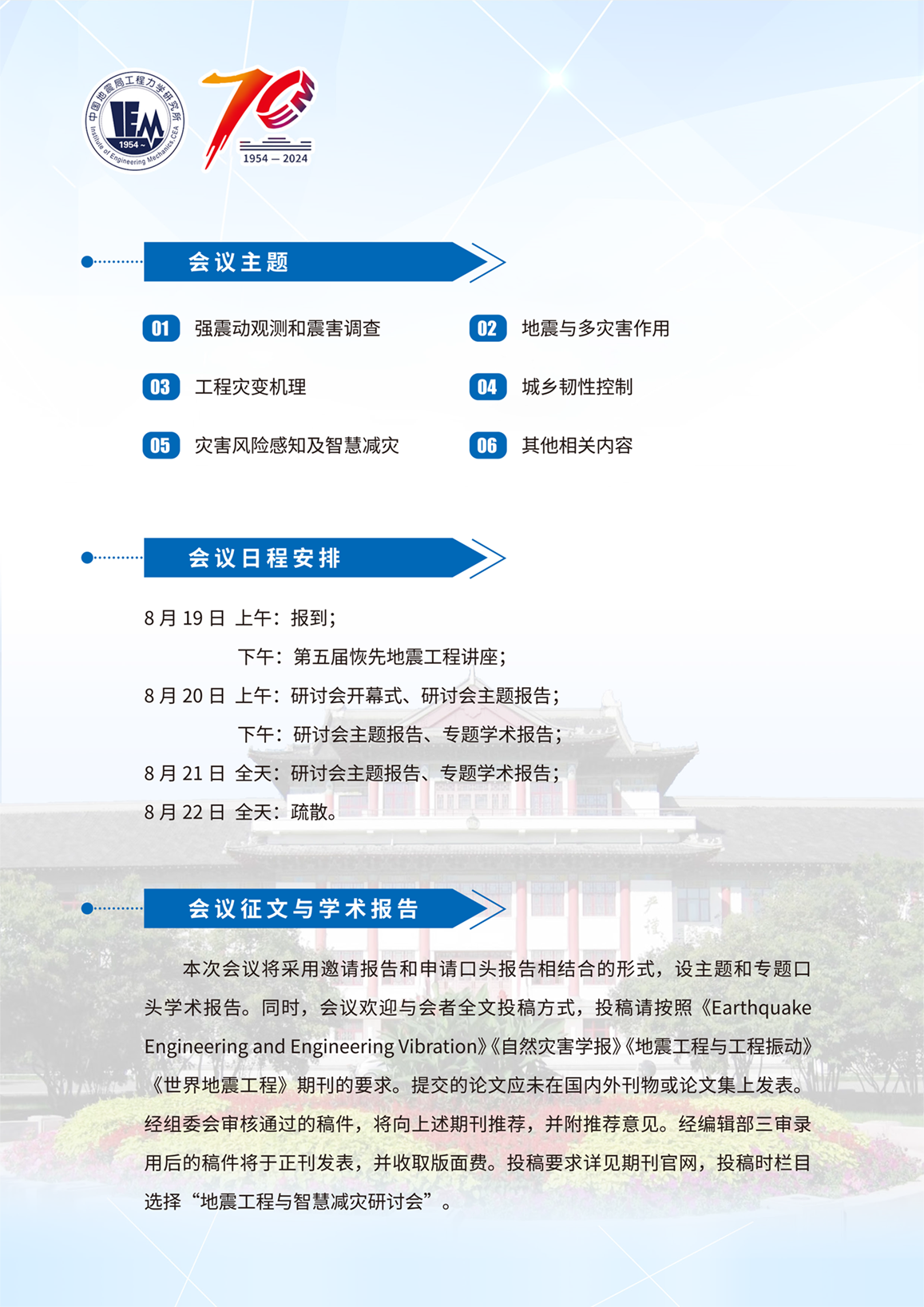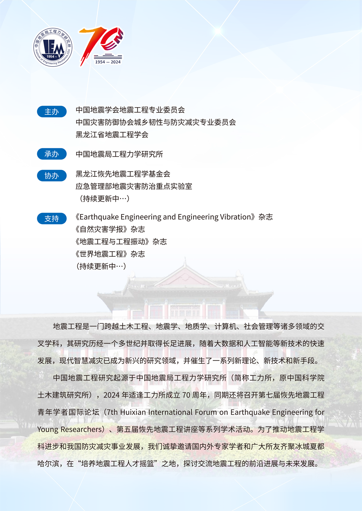 中國地震局工程力學研究所 地震工程與智慧減災研討會暨第四屆韌性城鄉與防災減災論壇(一號通知)