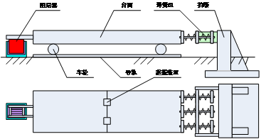 機械式單向水平正弦振動臺原理圖如圖1所示,臺面為一臺火車皮,上有10cm厚的鋼筋混凝土作上臺面,尺寸為12×3.3m,自重20噸,可載重20噸的試件。臺面由兩對車輪支承導向,車輪在導軌上滾動。臺體一端有彈簧組連到擋墻上,另一端連有摩擦阻尼器。臺體中間為起振裝置,由兩組偏心輪組成,產生單向激振力,見圖2。起振裝置有兩組傘形齒輪換向,用95馬力的解放牌汽車發動機驅動。最大出力40噸,最高頻率40Hz。