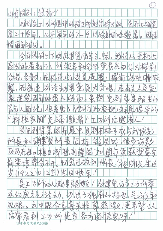 發布時間: 2021-08-20 點擊數量:7052“以人性化服務和溫情服務為宗旨,努力做到讓老同志方便、放心、滿意,感受到家人般的溫暖”,這是離退休辦公室的服務宗旨。近日,一封感謝信從遠在上海定居的老同志寄來,信里表達了對工力所在建黨百年之際取得的成績感到驕傲和自豪,重點感謝了離退辦同志對異地居住和就醫的老同志給予生活上和就醫方面的關心和幫助。他飽含感激之情地講述了幾件事,他說“我們講述幾件個人小事,但能說明工力所不單培養科技人才,為民辦事一般工作人員也是稱職的?!薄叭娜鉃槿嗣穹盏木駛鬟f了黨和政府對老年人的關愛”……老同志口中的小事都是我們為群眾服務的大事,我們要為群眾辦真事、真辦事。