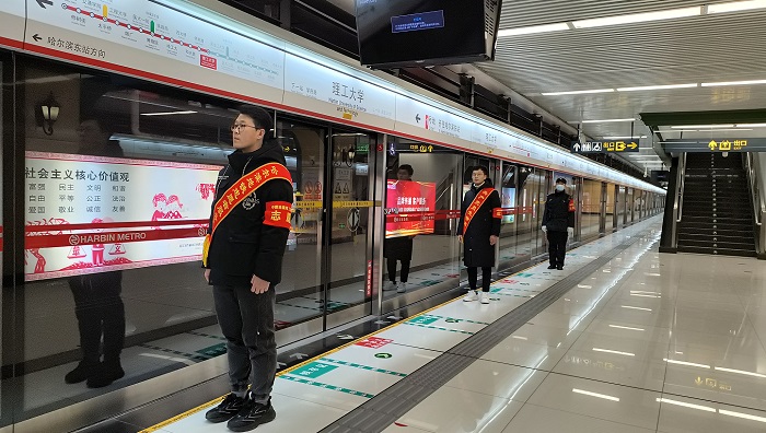 青年志愿者來到哈爾濱地鐵“理工大學(xué)站”開展了志愿服務(wù),他們身著禮儀綬帶、紅色袖標(biāo)站在地鐵站的出入口、售票機(jī)、閘機(jī)口、上下站等位置,為乘客提供指引、咨詢、購票等一系列乘車服務(wù),并開展了站內(nèi)地面、墻面清潔工作。