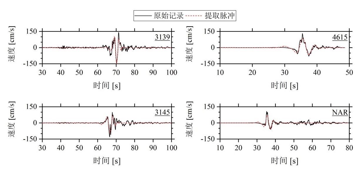 利用強震動觀測記錄識別了此次地震中近斷層地震動是否存在速度脈沖效應。結果顯示,公開發布的18組強震動記錄是典型的脈沖型地震動(見表1),部分脈沖記錄及提取的速度脈沖見圖2。