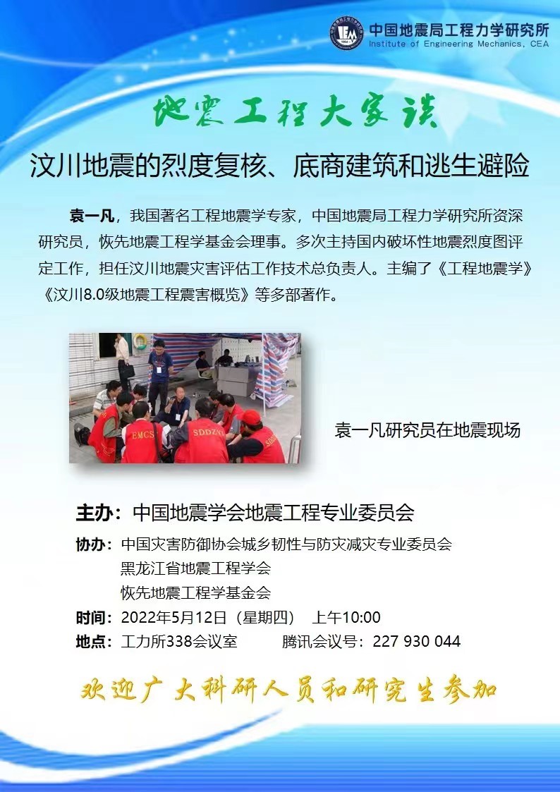 主題講座。5月12日,為提升全社會(huì)防災(zāi)減災(zāi)能力,我所舉辦了“地震工程大家談”主題講座,邀請(qǐng)了我所袁一凡研究員在線上作了題為《汶川地震的烈度復(fù)核、底商建筑和逃生避險(xiǎn)》報(bào)告。