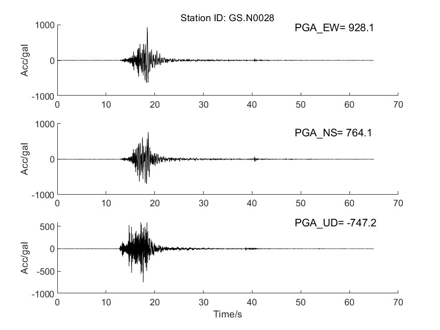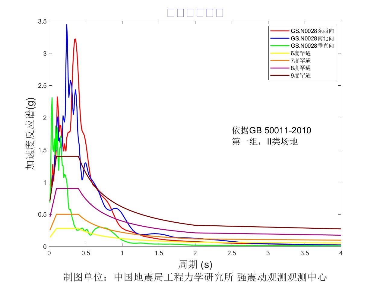 地震后工力所強震動觀測中心共收取距震中100公里范圍內實時強震儀記錄57組、烈度儀記錄182組。中心立即組織人員進行處理。獲取記錄臺站加速度記錄分析結果見表1,其中GS.N0028 臺烈度最大,其震中距為13.6km,東西、 南北、 垂直向加速度峰值分別為 905.8cm/s2、778.5cm/ s2、-702.4cm/ s2,東西、南北、垂直向速度峰值分別為57.3cm/s、-52.1cm/s、-16.3 cm/s,計算儀器地震烈度9.5度。GS.N002B 臺峰值加速度最大,其震中距為12.3km,東西、 南北、 垂直向加速度峰值分別為 1071.4cm/s2、856.8cm/ s2、796.1cm/ s2,東西、南北、垂直向速度峰值分別為-30.7cm/s、-21.5cm/s、-10.1 cm/s,計算儀器地震烈度9.2度。GS.N0027臺震中距最小,其震中距為5.8km,東西、南北、垂直向加速度峰值分別為823.9cm/s2、-533.3cm/ s2、 692.7cm/ s2,東西、南北、垂直向速度峰值分別為-39.8cm/s、-28.9cm/s、-11.3 cm/s,計算儀器地震烈度8.8度。儀器地震烈度分布圖見圖1,地震峰值加速度分布圖見圖2,地震峰值速度分布圖見圖3,地震加速度反應譜(T=0.3s、T=1.0s、T=3.0s)分布圖見圖4、圖5、圖6,GS.N0028 臺強震動記錄見圖7,GS.N0028臺加速度反應譜見圖8,GS.N0028臺傅里葉幅值譜見圖9,GS.N002B臺強震動記錄見圖10,GS.N002B臺加速度反應譜見圖11,GS.N002B臺傅里葉幅值譜見圖12,GS.N0027臺強震動記錄見圖13,GS.N0027臺加速度反應譜見圖14,GS.N0027臺傅里葉幅值譜見圖15。
