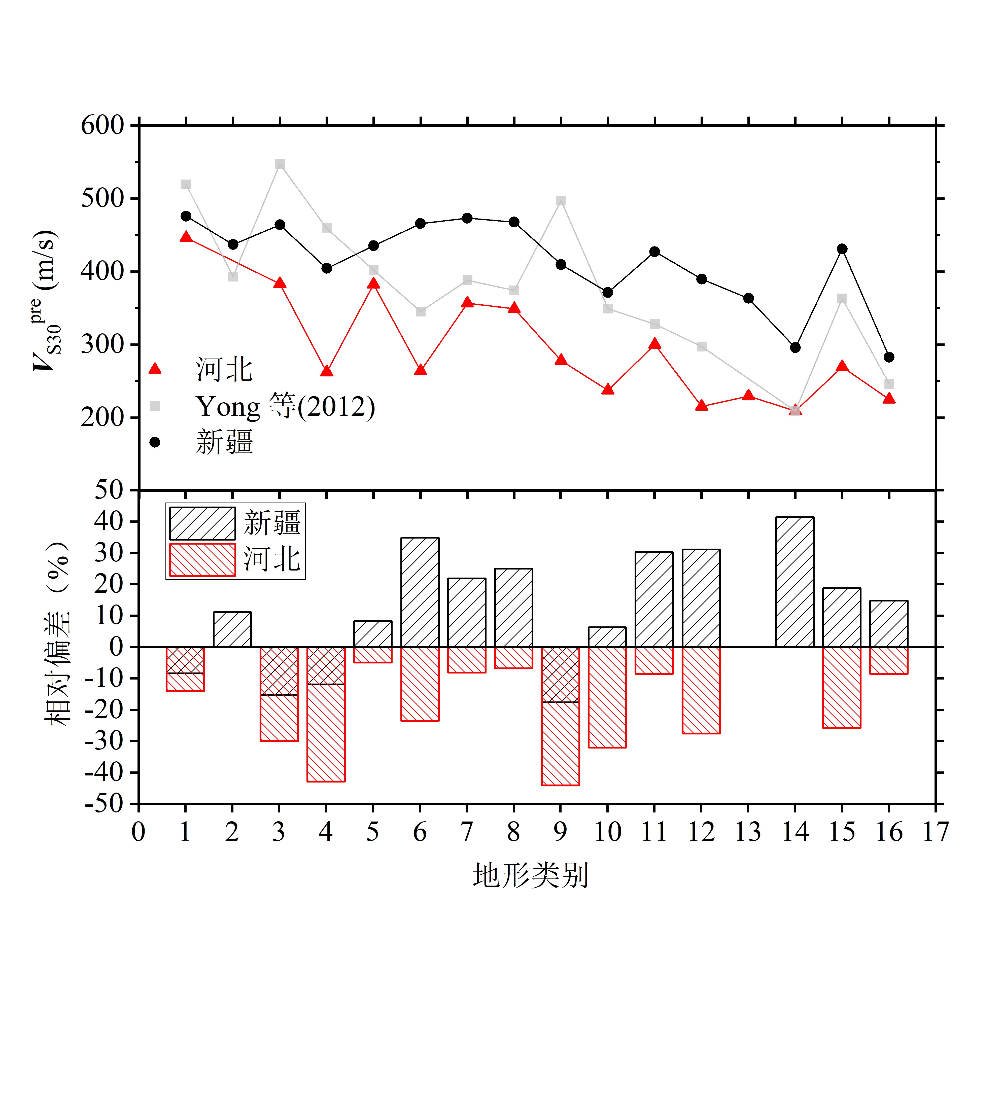 圖2 新疆與河北地區16個地形類別的VS30最佳預測值及與Yong等(2012)結果的比較