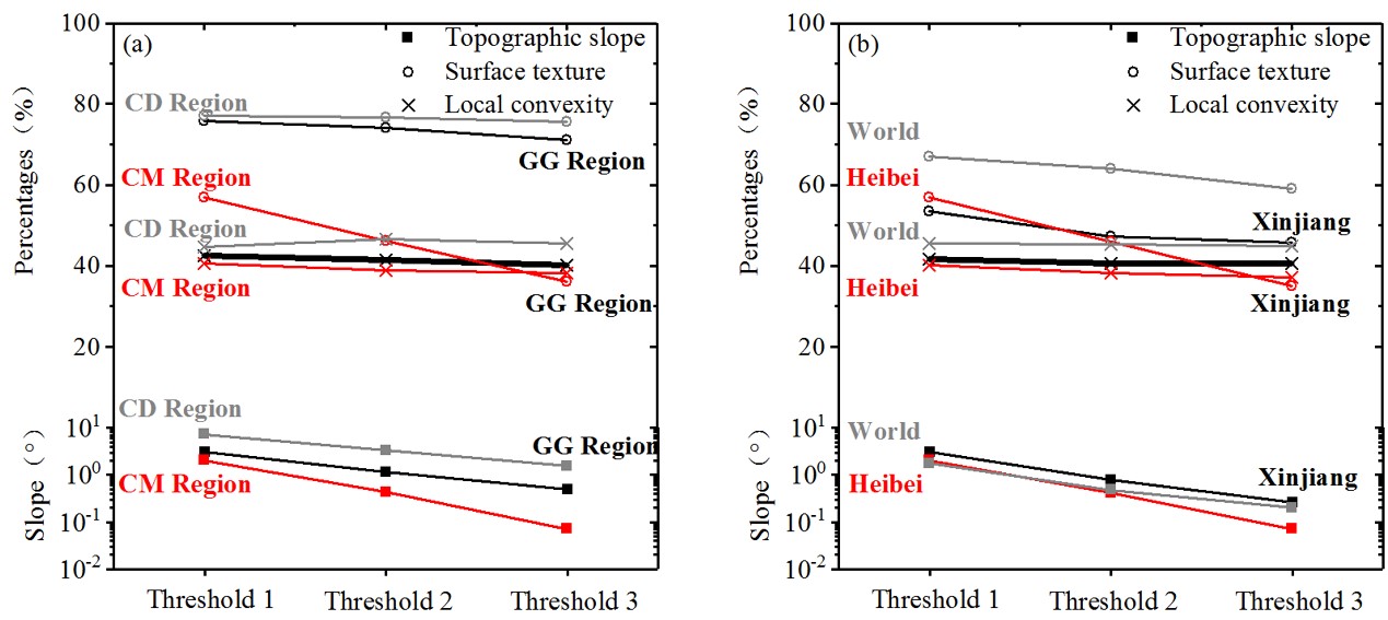 圖3三項地形特征參數(坡度、紋理及凸度)的閾值:(a)首都圈、川滇及兩廣地區;(b)新疆、河北省及全球