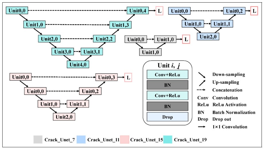 該成果在結(jié)構(gòu)健康監(jiān)測領(lǐng)域的國際權(quán)威期刊《Structural Health Monitoring-An International Journal》發(fā)表。(Zhang Lingxin, Shen Junkai*, Zhu Baijie. A research on an improved Unet-based concrete crack detection algorithm [J]. Structural Health Monitoring, 2021, 20(4): 1864-1879. DOI: https://doi.org/10.1177/1475921720940068) (IF: 5.929, *通訊作者)